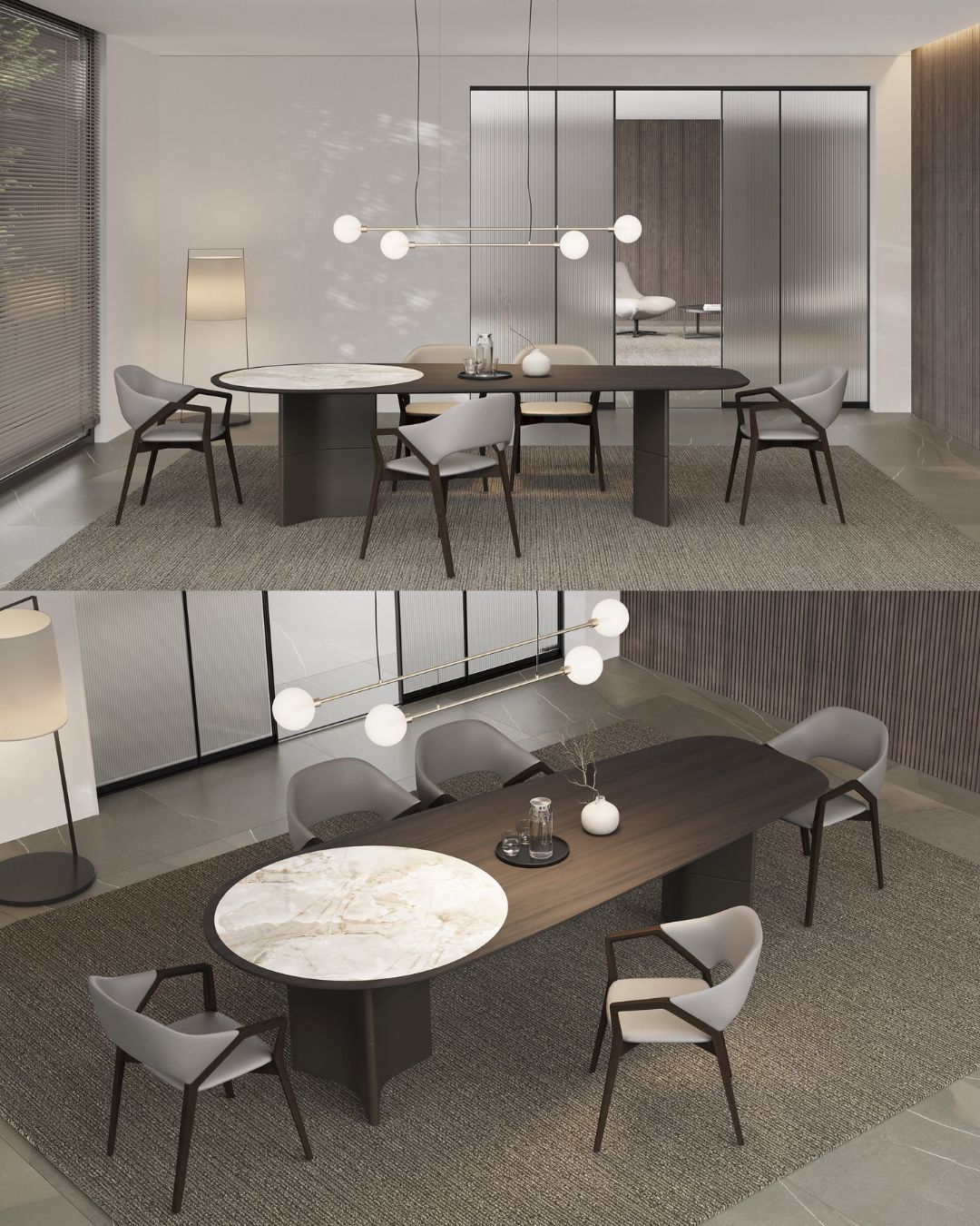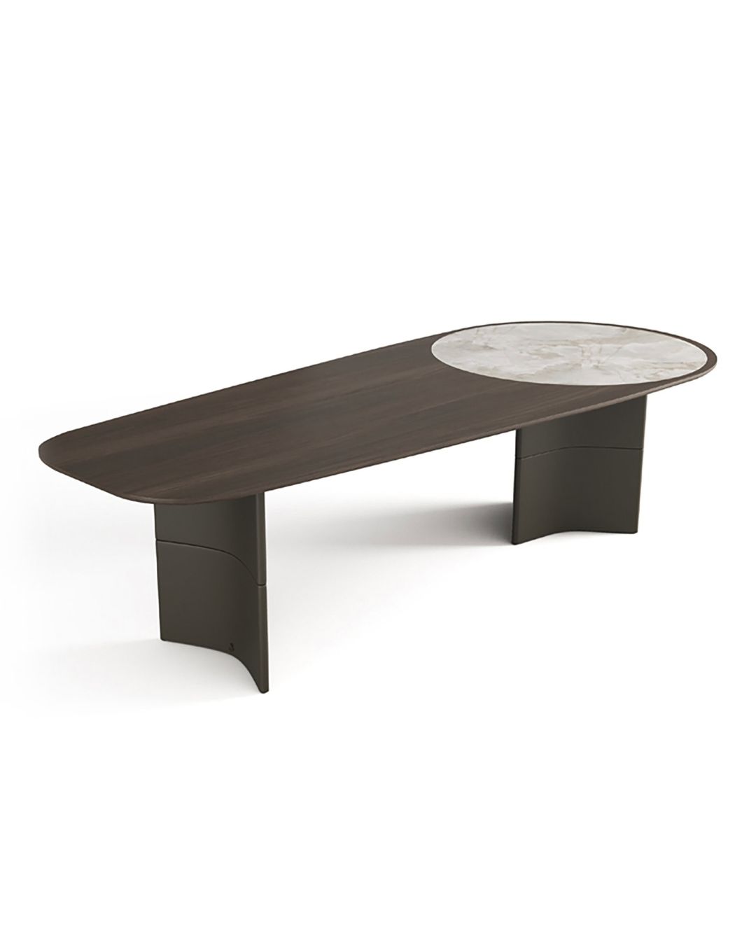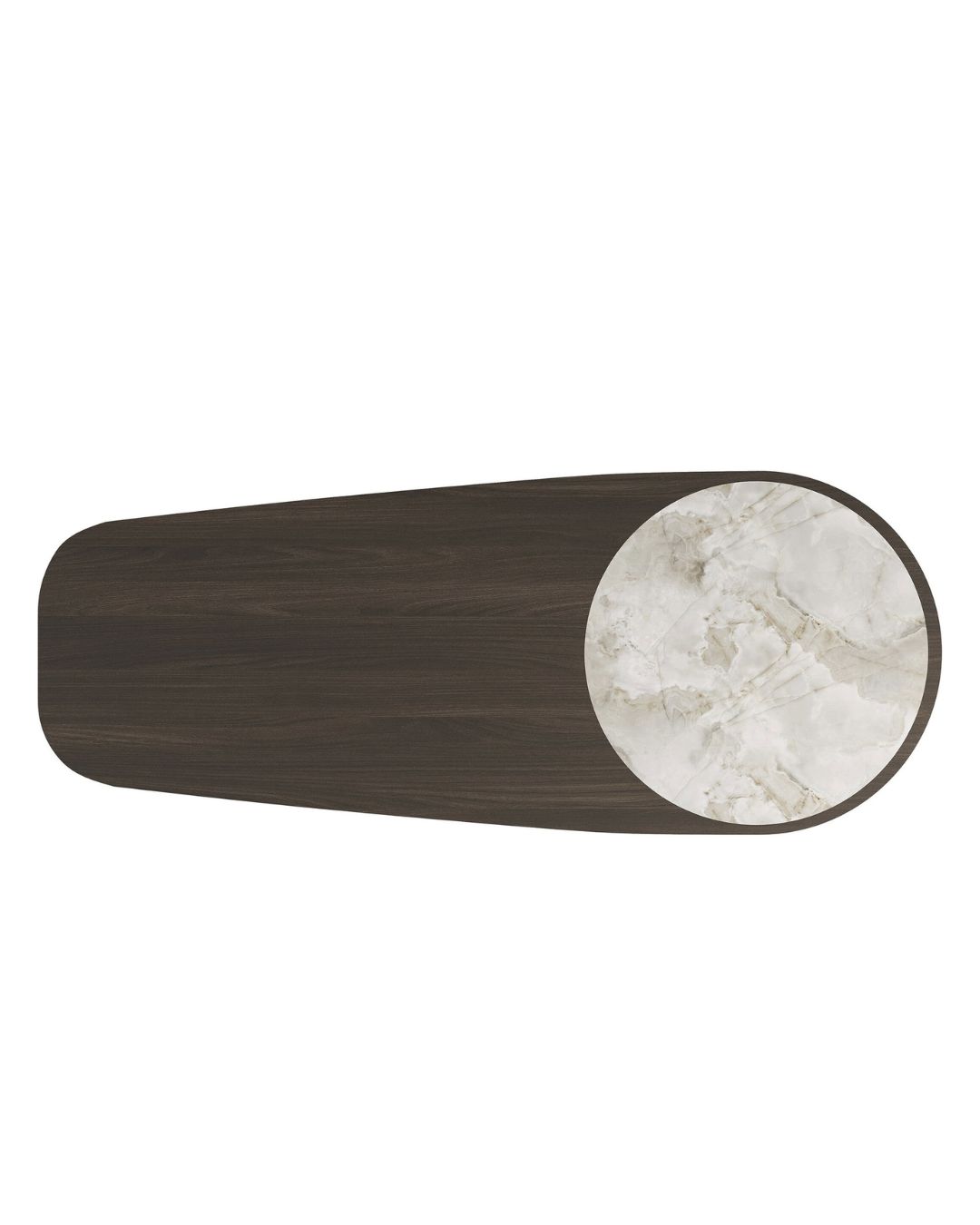ARK ELEGANT valgomojo stalas – rafinuotas pasirinkimas šiuolaikiškam interjerui. Stalas pagamintas iš aukštos kokybės natūralaus riešutmedžio, pasižyminčio šiltu atspalviu ir subtilia medienos tekstūra. Išskirtinį charakterį baldui suteikia keramikinis intarpas – pagrindinis dizaino akcentas, pabrėžiantis jo eleganciją ir išskirtinumą.