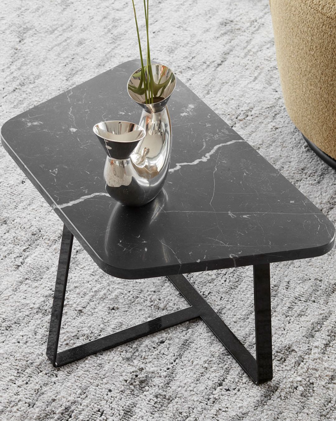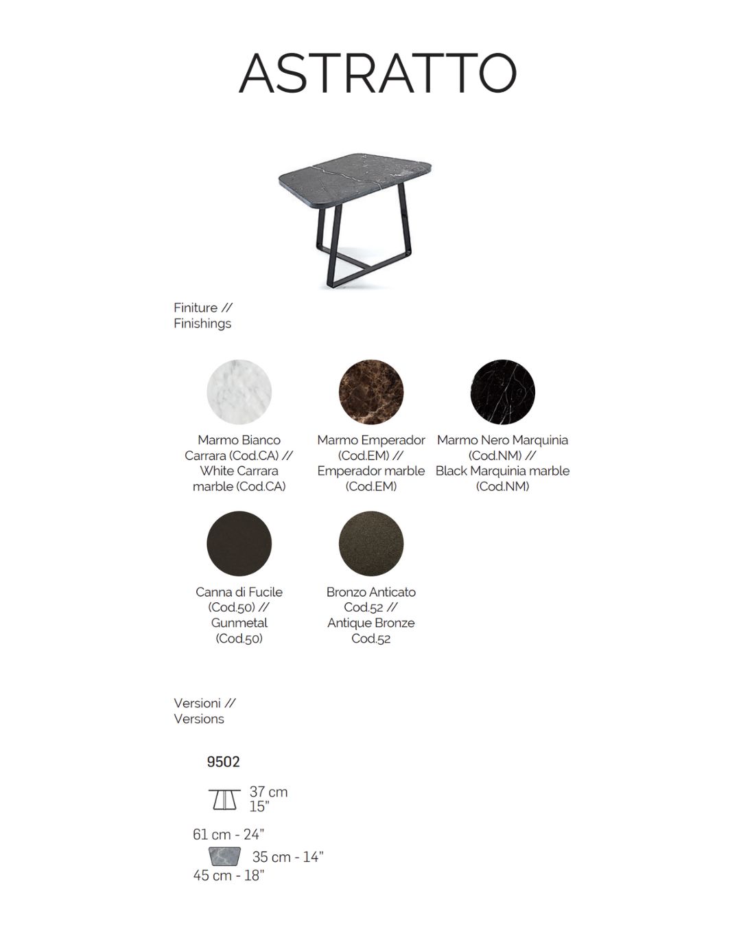 ASTRATTO kavos staliukas – tai trapecijos formos nedidelis kavos staliukas su marmuriniu stalviršiu, kuris suteikia jam išskirtinio rafinuotumo ir elegancijos. Skulptūriška forma kartu su natūralaus marmuro prabanga sukuria subtilų, tačiau akį traukiantį akcentą, puikiai papildantį modernios svetainės interjerą.
