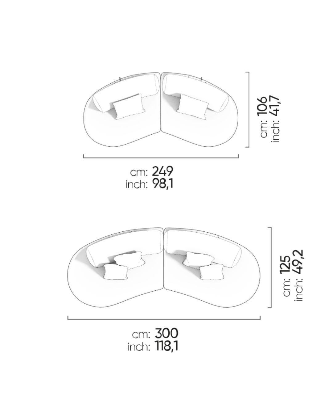 • Matmenys: ilgis – 249cm, gylis – 106cm, aukštis – 44/82cm