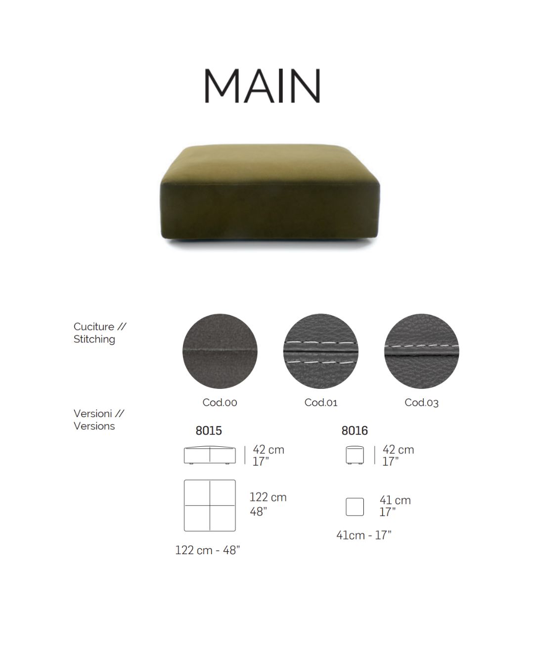 MAIN pufas – kvadrato formos pufas, kuris gali būti pagamintas tiek iš audinio, tiek iš natūralios odos. Puikiai papildo išskirtines Nicoline sofų kompozicijas ir harmoningai įsilieja į bendrą interjero visumą.