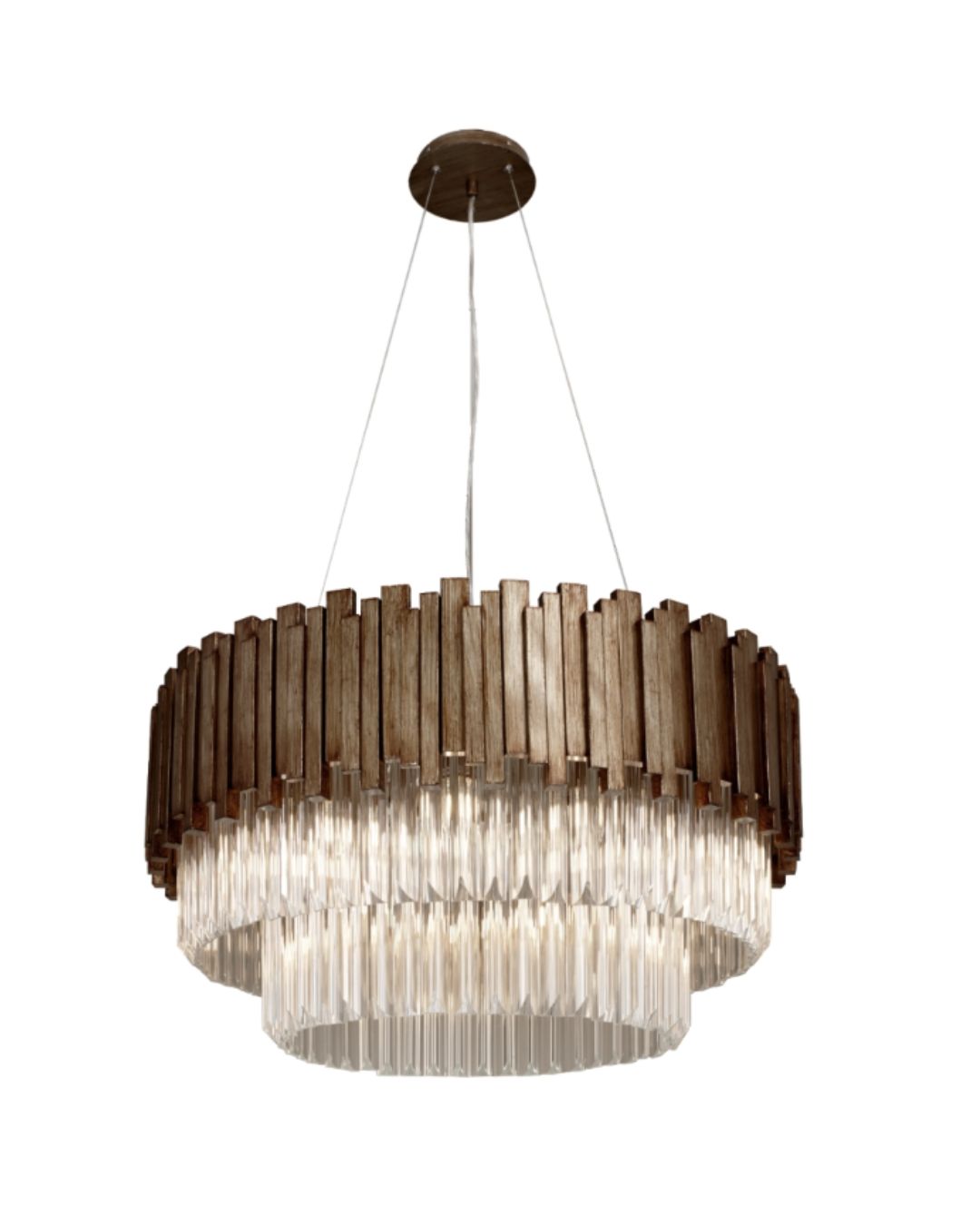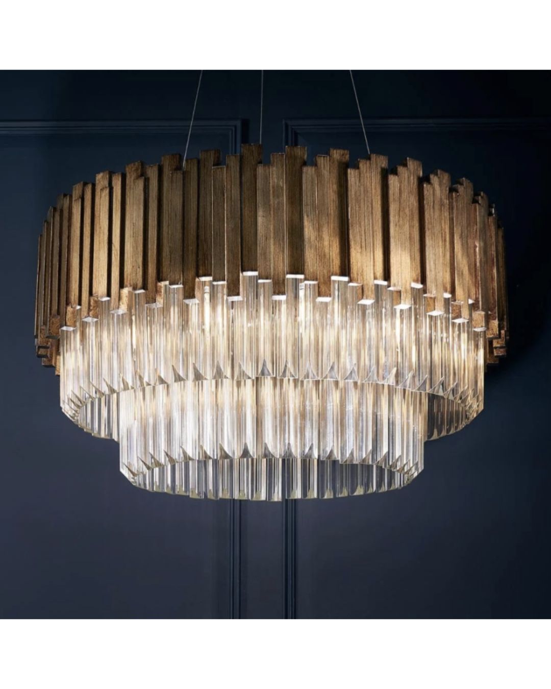 MAIVE – tai pakabinamas šviestuvas, kuriame subtiliai susilieja prabanga ir modernus dizainas. Jo konstrukciją puošia stiklo detalės, derinamos su sendinto aukso spalvos metalu, sukuriančiu išskirtinį šviesos ir šešėlių žaismą.