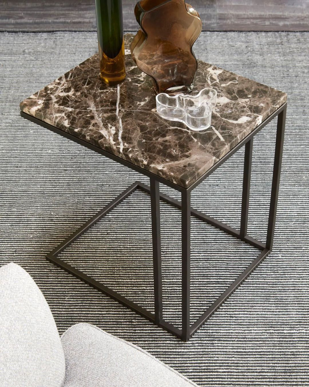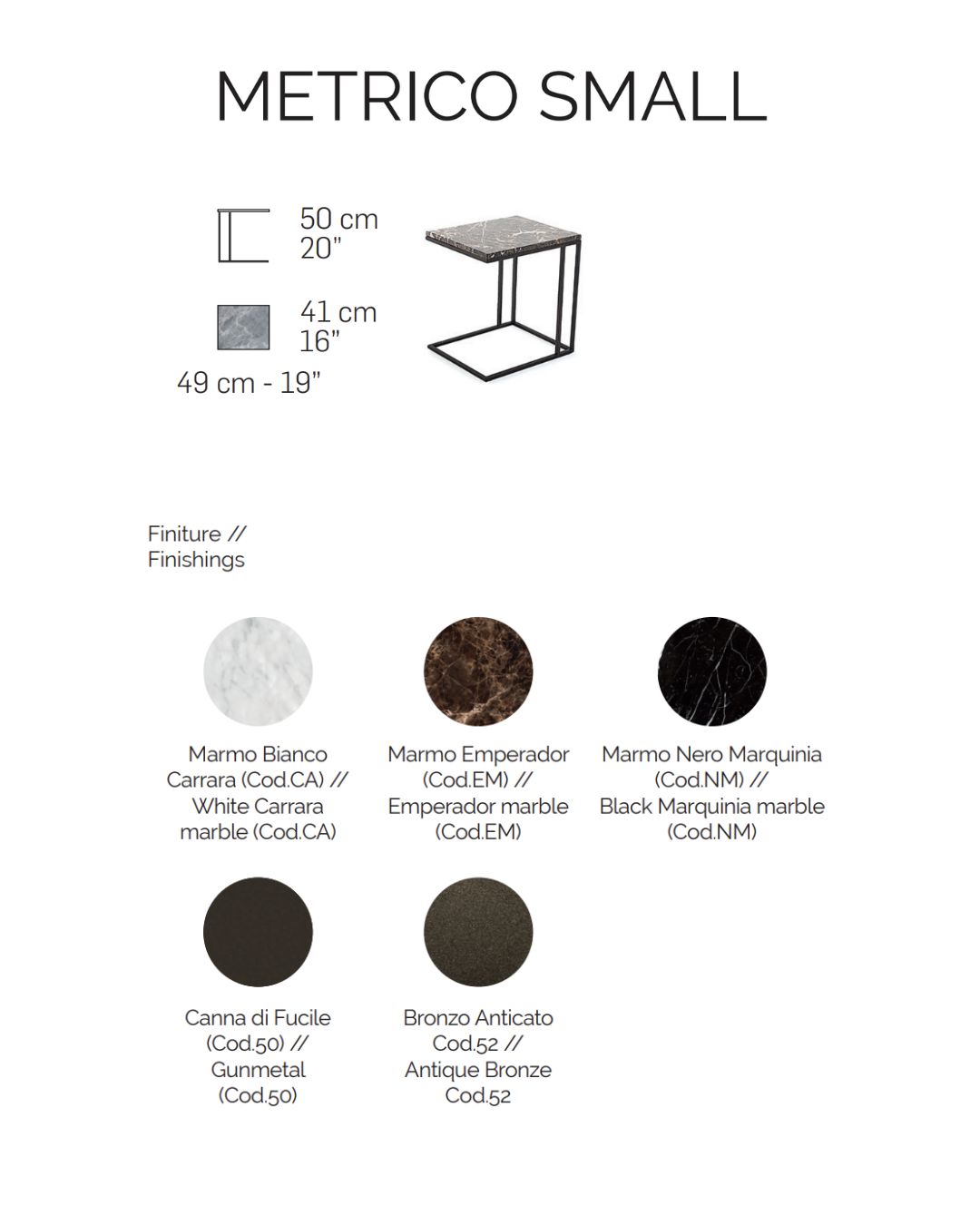 METRICO SMALL kavos staliukas išsiskiria solidžiomis proporcijomis ir griežta kvadratine forma. Stalviršį laiko tvirta metalo konstrukcija, suteikianti baldui modernų ir industrinį charakterį. Staliuko stalviršis gali būti pasirenkamas iš skirtingų marmuro variantų, leidžiančių pritaikyti dizainą prie individualaus interjero stiliaus.