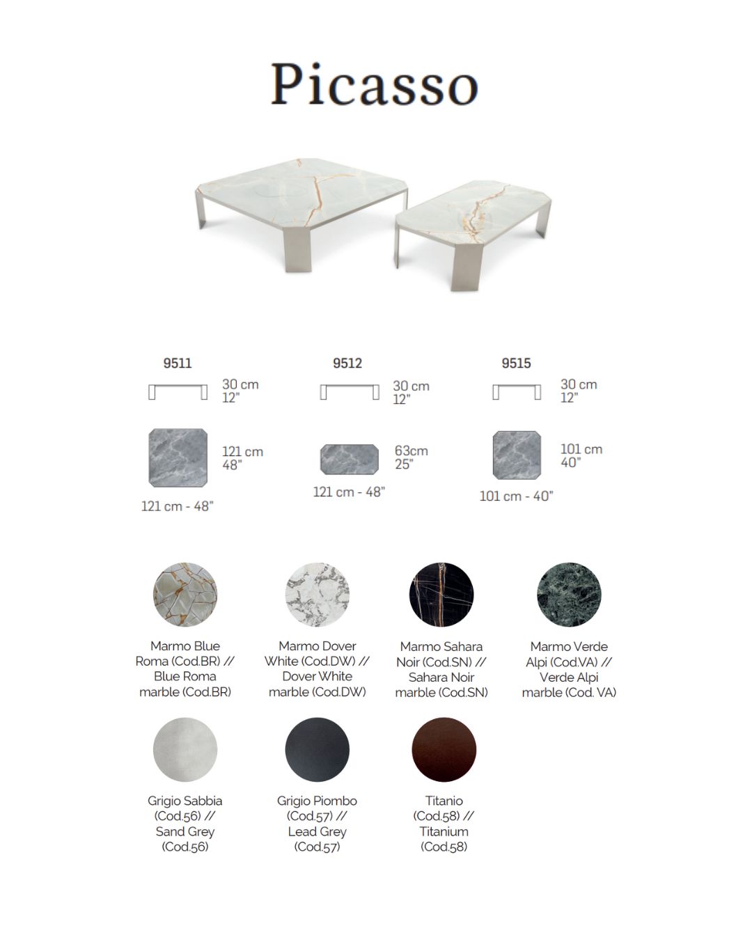 PICASSO kavos staliukas – kolekcija, išsiskirianti griežta ir aiškia stalviršio forma, suteikiančia baldui dinamiškumo bei išraiškingo charakterio. Skirtingų medžiagų deriniai kuria ryškius tekstūrų ir paviršių kontrastus, subtiliai pabrėždami išskirtinį PICASSO kavos staliuko dizainą.
