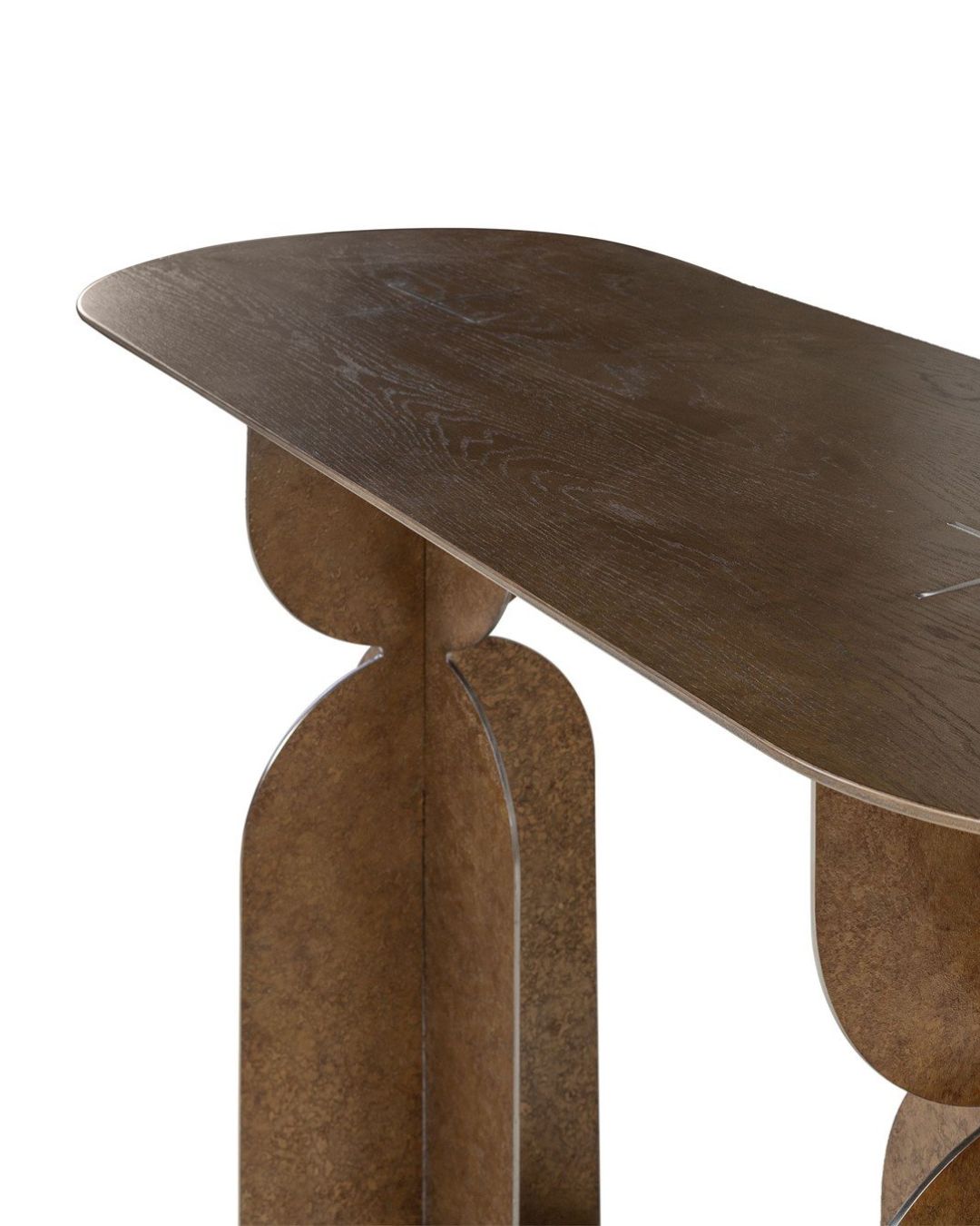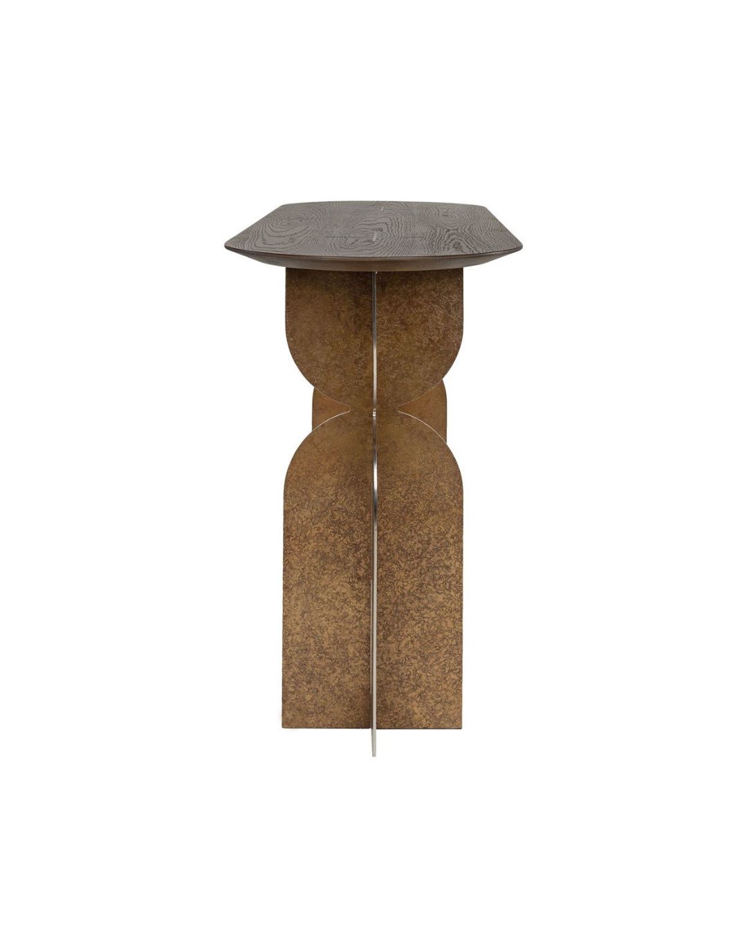 RAY CONSOLE – išskirtinio dizaino konsolė iš Versmissen. Pagaminta iš tvirto plieno ir MDF plokštės, padengtos natūralios ąžuolo faneruotės sluoksniu. Konsolė puikiai tinka prieškambario interjerui papildyti.